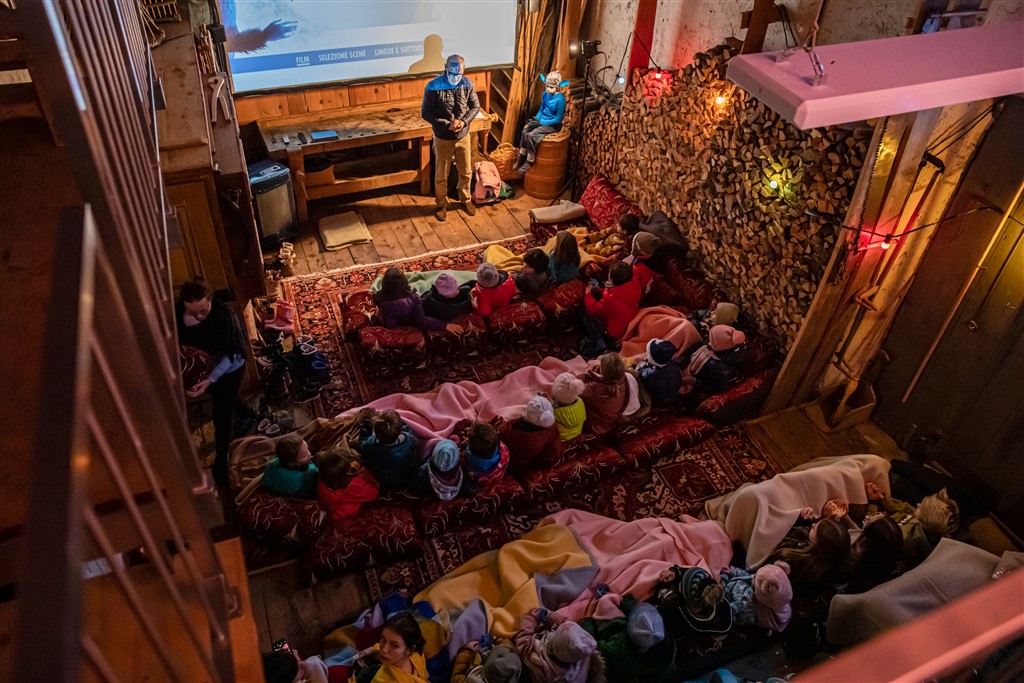 I due pomeriggi si sono svolti nella cornice della mason, temperata per l’occasione, con il tutto esaurito: presenti, per entrambe le proiezioni, una trentina di bambini e una dozzina di adulti. I più piccoli erano accomodati su confortevoli materassi e cuscini e in parte sulla balconata; i grandi, invece, erano seduti sulla tribuna creata appositamente l’estate scorsa. Calde coperte erano a disposizione per tutti.