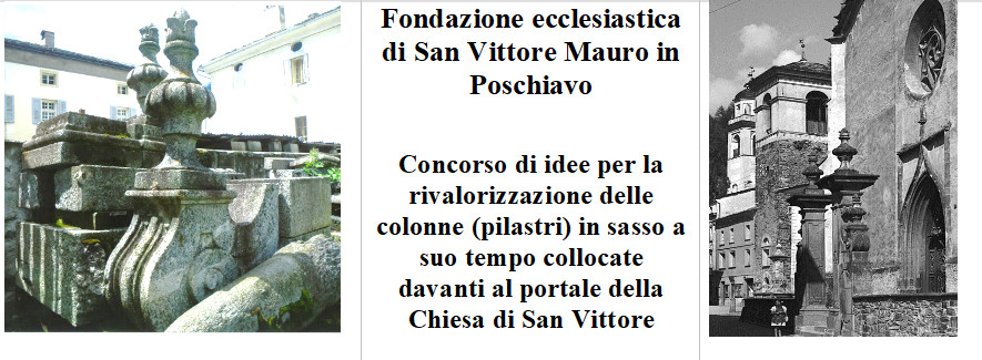 La Fondazione ecclesiastica di San Vittore Mauro in Poschiavo intende indire un concorso di idee per premiare la migliore proposta volta al recupero e alla rivalorizzazione delle colonne (pilastri) in sasso a suo tempo collocate davanti al portale della chiesa collegiata di San Vittore e attualmente depositate nel giardino della casa parrocchiale.