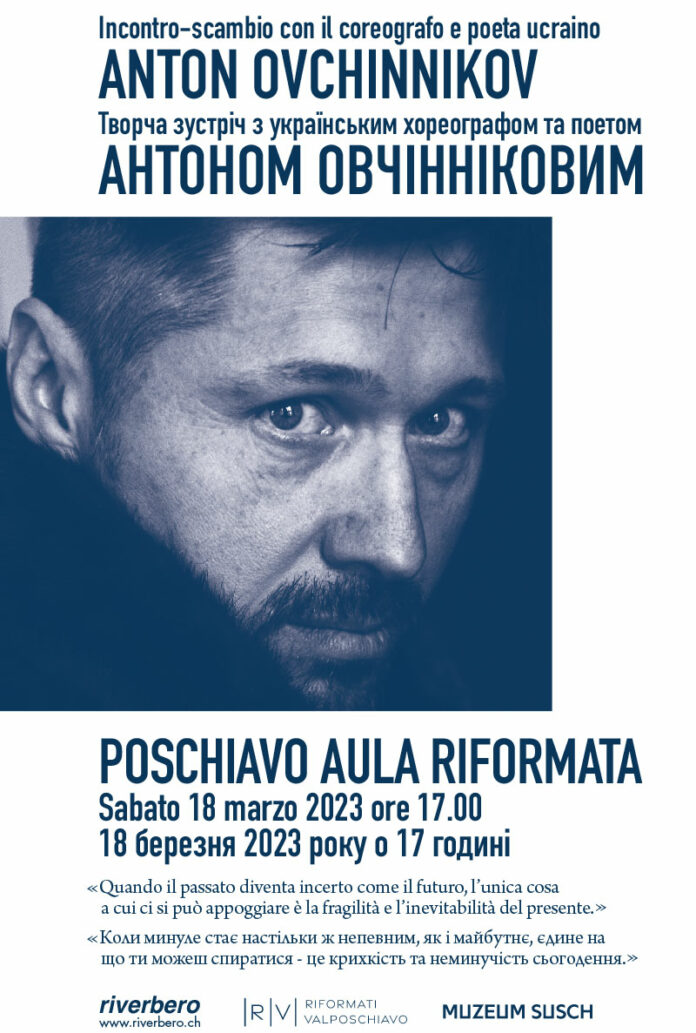 Anton Ovchinnikov è coreografo, performer, poeta, organizzatore di eventi, co-fondatore di una piattaforma, attiva in tutta l’Ucraina, che promuove la danza contemporanea. Attualmente è in residenza artistica in Engadina, presso il Muzeum di Susch. Dopo l’inizio della guerra in Ucraina ha scritto un “Manifesto” (disponibile in inglese su www.riverbero.ch) in cui parla dell’in-certezza, dell’in-sicurezza, della s-fiducia, dell’ir-reversibilità, dell’im-possibilità che accompagnano la creazione artistica e la vita degli artisti in questo momento.