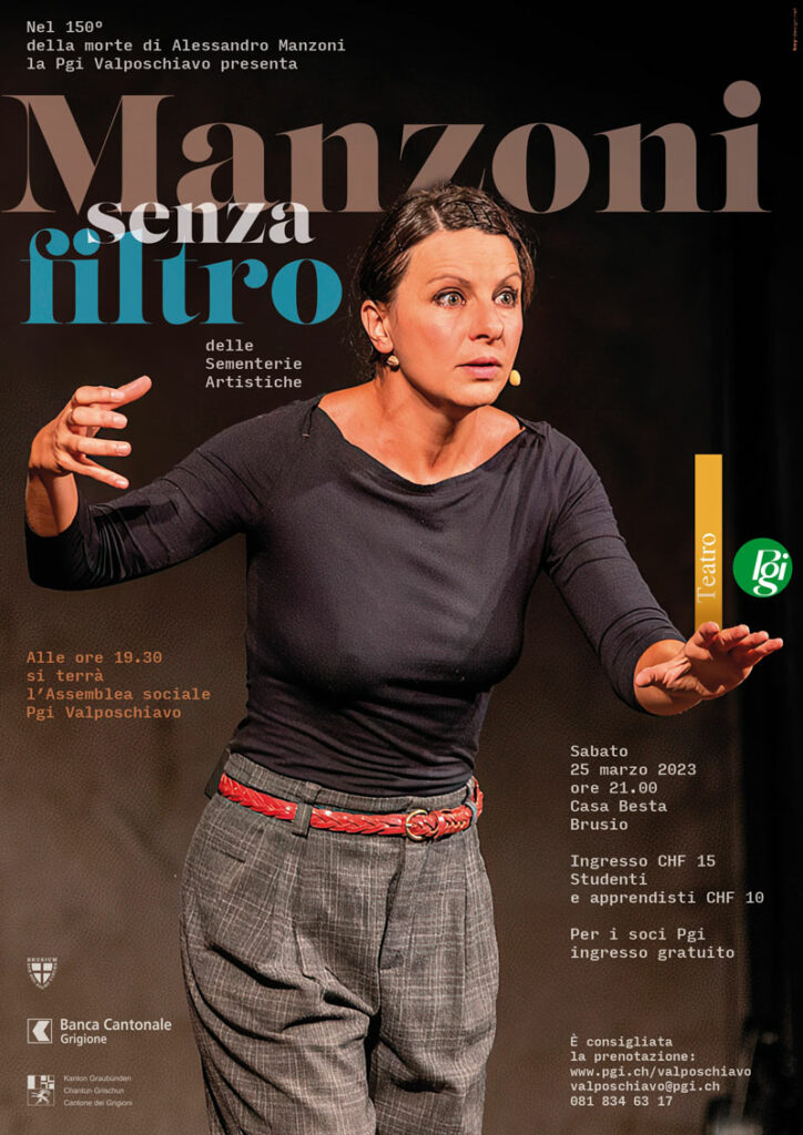 In occasione del 150° della morte di Alessandro Manzoni, la Pgi Valposchiavo propone lo spettacolo “Manzoni senza filtro” un funambolesco viaggio tra le pagine de I promessi sposi, dove ci sarà ancora modo di sorprendersi di una storia che riteniamo nota e conosciuta e che riserva tuttavia ancora spazio per approfondire e riflettere, ma anche per ridere, commuoversi e indignarsi. La riscrittura, che rispetta lo stile e la profondità dell’opera originale, permette l’avvicinamento ad un linguaggio e ad un impianto narrativo d’altri tempi mettendo in luce gli aspetti più comici e grotteschi della scrittura manzoniana e la critica politica nascosta dietro un apparente lieto fine che si fa tragico nella cruda realtà della peste. Dalla narrazione emergono scene del testo originale in cui prendono vita i diversi personaggi: naturalmente Renzo e Lucia ma anche l’avvocato Azzecca Garbugli, il gran consigliere Antonio Ferrer, la monaca di Monza e l’immancabile Innominato messi a nudo nelle loro debolezze e contraddizioni.