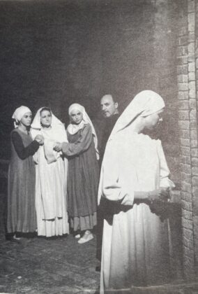 Il secondo atto si svolge in uno spazio molto particolare e con una struttura circolare, la chiesa del santo Sepolcro. Il terzo atto ha una struttura semplice e arcaica, in simbolica sintonia con il cortile di Pilato dove ha luogo il finale dello spettacolo. Mentre padre Goffredo chiude lo spettacolo: “Ildegarda si tace ma non tace la sua parola santa…”, l’amatissima Richardis intona un canto sacro d’amore, e sulla parete di fronte al pubblico scorrono le immagini delle miniature delle opere di Ildegarda. La musica che fa da contrappunto ai versi di Grytzko Mascioni, scelta da Jolando Scarpa, è in gran parte quella che Ildegarda aveva composto per le funzioni religiose del convento di cui era badessa».