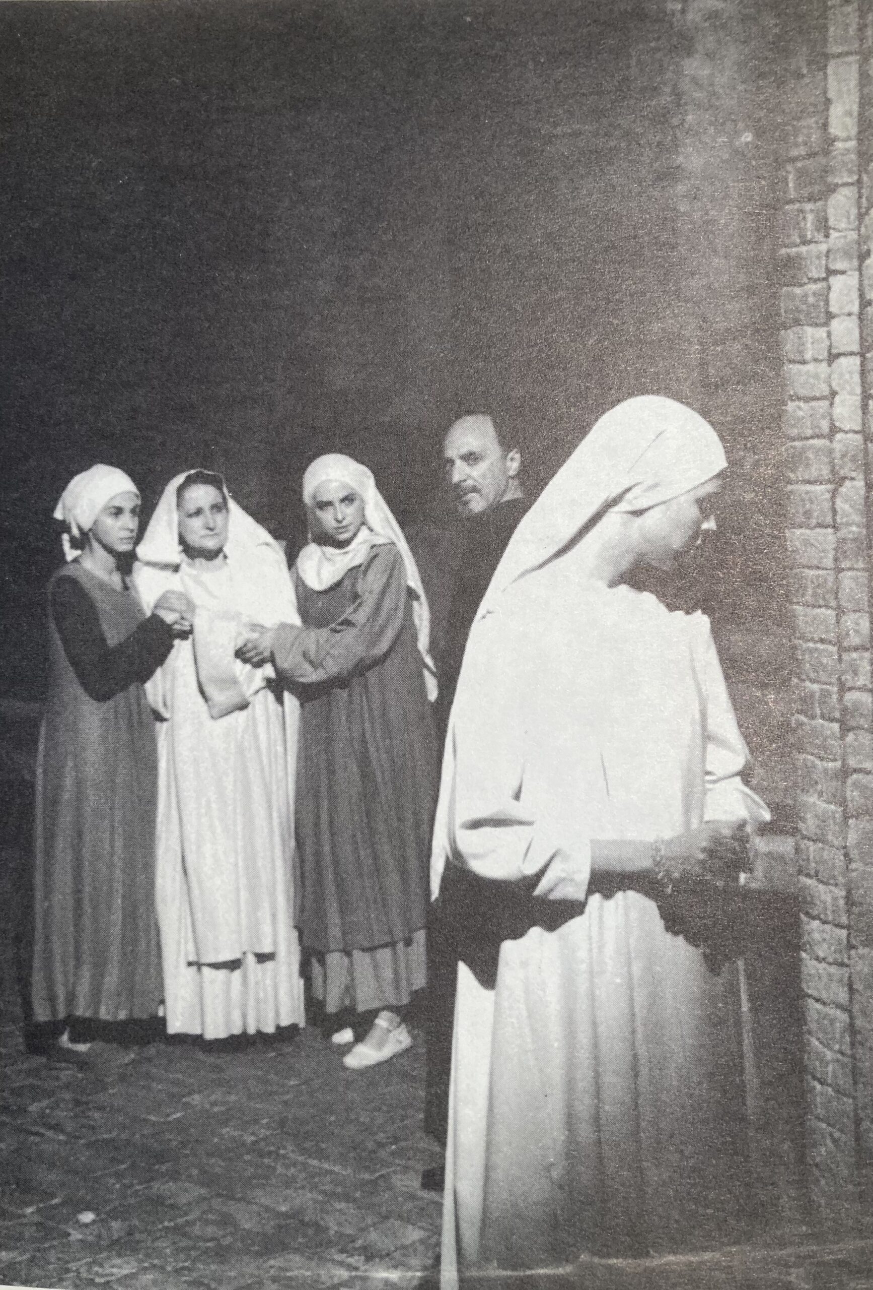«La protagonista, da me interpretata, un coprotagonista, padre Goffredo, le quattro monache che formano il coro, la scomparsa, amatissima Richardis, papa Eugenio III e l’imperatore Federico Barbarossa.