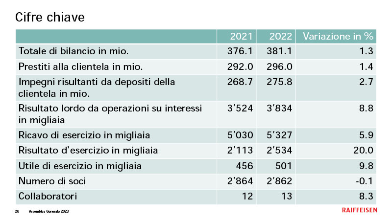 Al presidente del Consiglio d’Amministrazione è seguito il presidente della Direzione Matteo Marchesi, che ha ripreso il discorso della difficile situazione finanziaria globale, sottolineando però come la Raiffeisen Valposchiavo sia comunque riuscita ad incrementare ulteriormente i propri ricavi. Questi numeri confermano la stabilità dell’istituto che, in controtendenza con diversi altri istituti bancari, ha raggiunto questi risultati senza assumersi ulteriori rischi. Marchesi ha poi riassunto in breve le cifre chiave dell’anno 2022, partendo dal numero di soci che si mantiene stabile a 2’862 unità e rappresenta un numero molto importante in relazione al territorio di competenza di Raiffeisen Valposchiavo, che va da Campocologno all’Ospizio Bernina. Le ulteriori cifre sono riassunte anche nel grafico sottostante, dove si può notare un aumento della somma di bilancio a CHF 381 mio., a conferma della fiducia riposta dai clienti nei confronti della banca. Analogamente sono cresciuti anche i prestiti alla clientela, che ammontano a CHF 296 mio. così come i fondi della clientela cresciuti fino a CHF 276 mio. Complessivamente i ricavi superano i 5 millioni di franchi ed il risultato d’esercizio 2022 si attesta a 2.534 milioni di franchi, con un aumento di 422’000 franchi rispetto all’anno scorso. Questa cifra conferma lo sviluppo positivo e costante della banca e permette all’istituto di raggiungere un utile netto di esercizio di 501’000 franchi, cifra che attesta un importante aumento del 9.8% rispetto all’annata precedente. Al termine della presentazione delle cifre, Marchesi ricorda inoltre l’impegno di Raiffeisen Valposchiavo per le associazioni presenti sul territorio e invita i soci ad approfittare del programma MemberPlus, che regala molti vantaggi e mette a disposizione una vasta offerta di eventi. Concerti (come quello in Piazza di alcune settimane fa), musical, circo, eventi sportivi, spettacoli per bambini e molti altri come, ad esempio, l’Openair Cavaglia sono infatti accessibili a prezzi scontati grazie alla carta soci Raiffeisen ed al programma MemberPlus.
