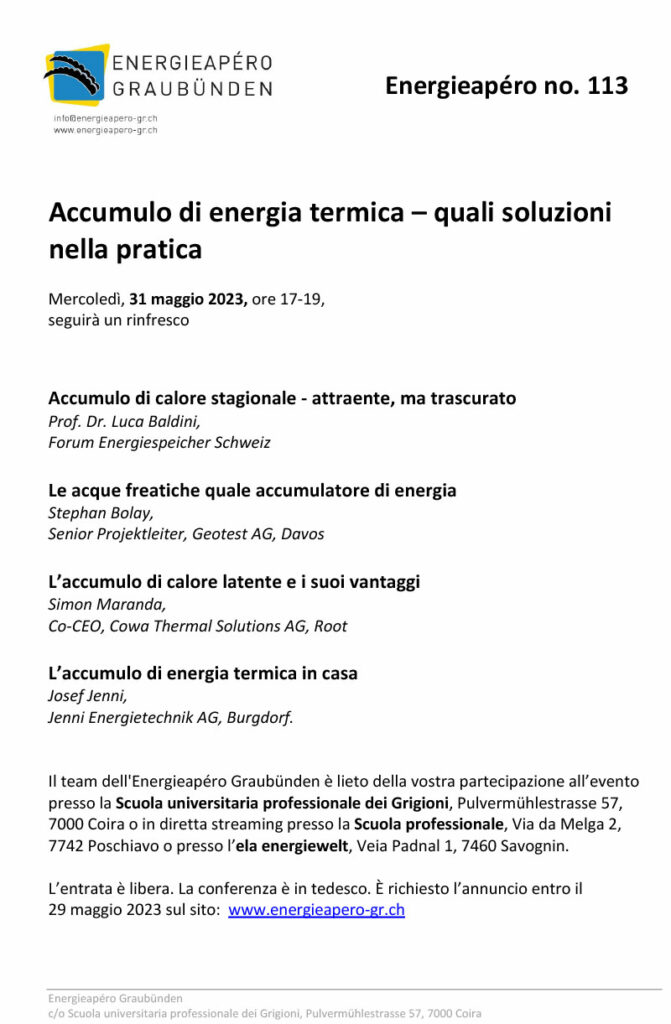 “Energie-Apéro” è una serie di conferenze promossa dall’Ufficio dell’energia e dei trasporti dei Grigioni e dalla Scuola universitaria professionale dei Grigioni di Coira (FHGR) in collaborazione con il Polo Poschiavo e l’ela energiewelt di Savognin. Le conferenze, giunte alla 113ª edizione, intendono promuovere le discussioni e gli sforzi nel campo del risparmio energetico. La conferenza è aperta a tutti e sarà videotrasmessa nell’aula per videoconferenze del Polo Poschiavo.