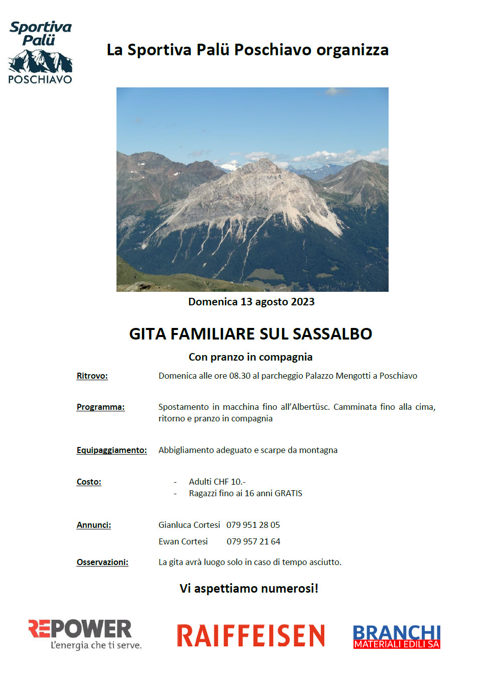 Senza categoria Gita familiare sul Sassalbo Domenica 13 agosto Di Sportiva Palü Poschiavo - 31 Luglio 2023 0 313