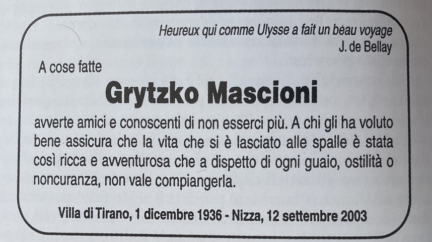 Grytzko Mascioni non è più. E noi ci sentiamo come defraudati, più po­veri e soli”: così inizia l’epitaffio funebre di Massimo Lardi in morte di Grytzko Mascioni. No, vedi foto, non è scolpito sulla lastra tombale (ma è come lo fosse), è invece l’inizio dell’affettuoso commiato, pubblicato in prima pagina da Il Grigione Italiano del 18 settembre 2003. E a pagina 3 dello stesso numero troviamo l’annuncio funebre.