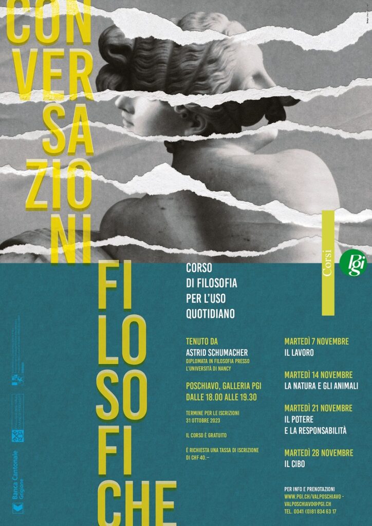 La Pgi Valposchiavo organizza per il mese di novembre le Conversazioni filosofiche, un Corso di filosofia per l’uso quotidiano che sarà tenuto da Astrid Schumacher, diplomata in Filosofia presso l’Università di Nancy. Quattro incontri per approfondire e riflettere, con l’aiuto delle idee dei filosofi del passato, su temi di stretta attualità e trovare spunti per affrontare le situazioni della vita di ogni giorno. Oggi, come nell’antichità, la filosofia è un riflettere insieme per capire il mondo in cui viviamo e trovare delle risposte alle nostre domande, un utile strumento di comprensione della vita e di approccio critico per guardare con maggiore obiettività la realtà che ci circonda e per saper anche mettere in discussione tante credute certezze.