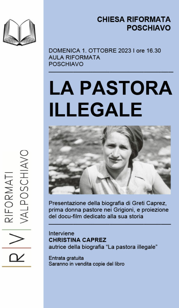 Uscita dapprima in tedesco, la biografia di Greti Caprez-Roffler, scritta dalla nipote Christina Caprez, è da poco disponibile in italiano, per i tipi di Armando Dadò editore (“La pastora illegale. Vita di Greti Caprez-Roffler”, prefazione di Daria Pezzoli-Olgiati). Il libro sarà presentato dalla sua autrice, a Poschiavo, presso l’Aula riformata domenica 1. ottobre, alle 16.30. In quell’occasione sarà proiettata la versione italiana di un breve docu-film, pure realizzato da Christina Caprez, dedicato alla prima pastora nei Grigioni.