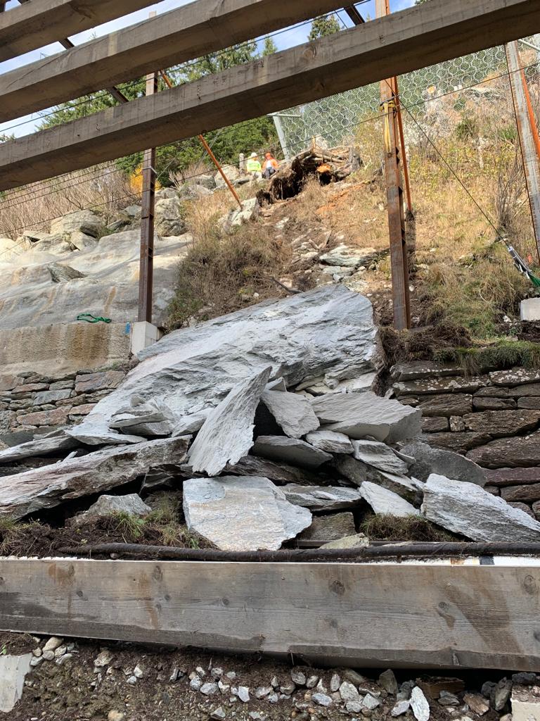 Per garantire la sicurezza dei collaboratori è stato possibile avviare i lavori di sgombero solo dopo il via libera alla zona pericolosa da parte di un geologo. Dalla valutazione del geologo è emerso che si sono staccati circa 1000 metri cubi di roccia. Gran parte è stata trattenuta dai dispositivi di protezione installati temporaneamente al di sopra del cantiere. Per poter aprire la strada al traffico il più presto possibile, venerdì sono state avviate diverse misure d’urgenza. Tra queste ultime rientrano tra l’altro l’abbattimento di alberi esposti, lavori di sgombero della roccia nel settore del punto di distacco nonché l’installazione di palizzate di protezione.