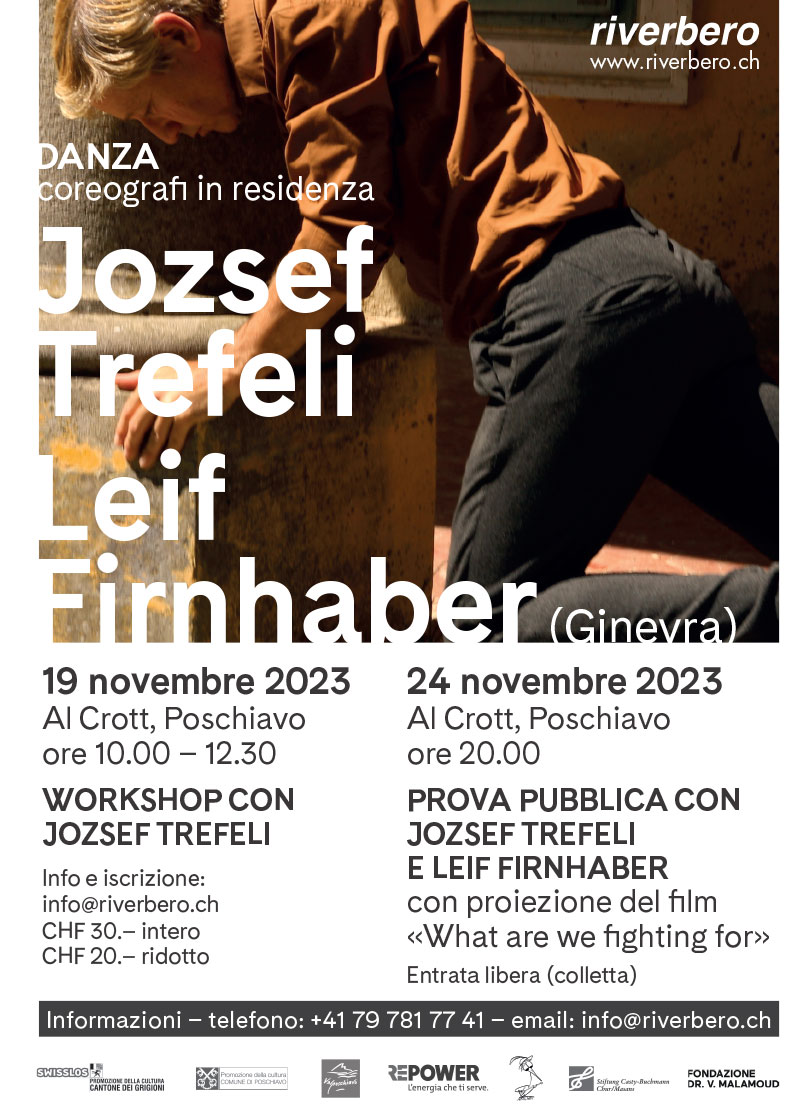 Nell’idea di mettere a disposizione uno spazio dedicato alla ricerca e alla creazione nel settore della danza e del movimento, di mettere in contatto la popolazione locale con danzatori e danzatrici professionisti provenienti da fuori e avvicinare il pubblico al lavoro di creazione, l’associazione culturale riverbero accoglie del 18 al 25 di novembre la prima residenza artistica per coreografi a Poschiavo, con i coreografi-danzatori Jozsef Trefeli e Leif Firnhaber, entrambi basati a Ginevra.