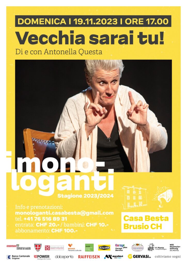 Il primo spettacolo in cartellone, previsto per domenica 19 novembre 2023 alle ore 17, presso Casa Besta a Brusio, vedrà in scena Antonella Questa, già ospite dei MONOLOGANTI nella scorsa stagione.