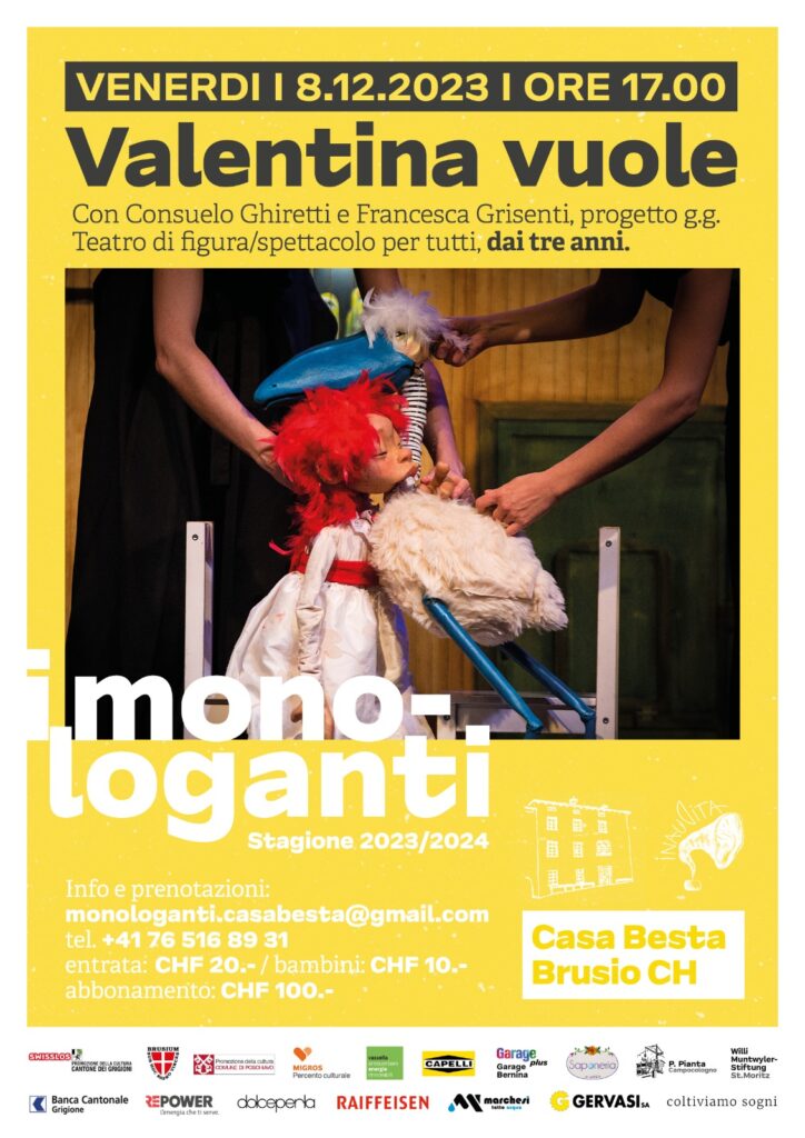 Un appuntamento rivolto a grandi e piccini, quello di venerdì 8 dicembre 2023 alle ore 17 presso Casa Besta a Brusio, che per la rassegna I MONOLOGANTI porta in scena VALENTINA VUOLE della compagnia progetto g.g, con Consuelo Ghiretti e Francesca Grisenti. Uno spettacolo di figura della durata di 50 minuti, rivolto ai bambini dai 3 anni e alle loro famiglie.