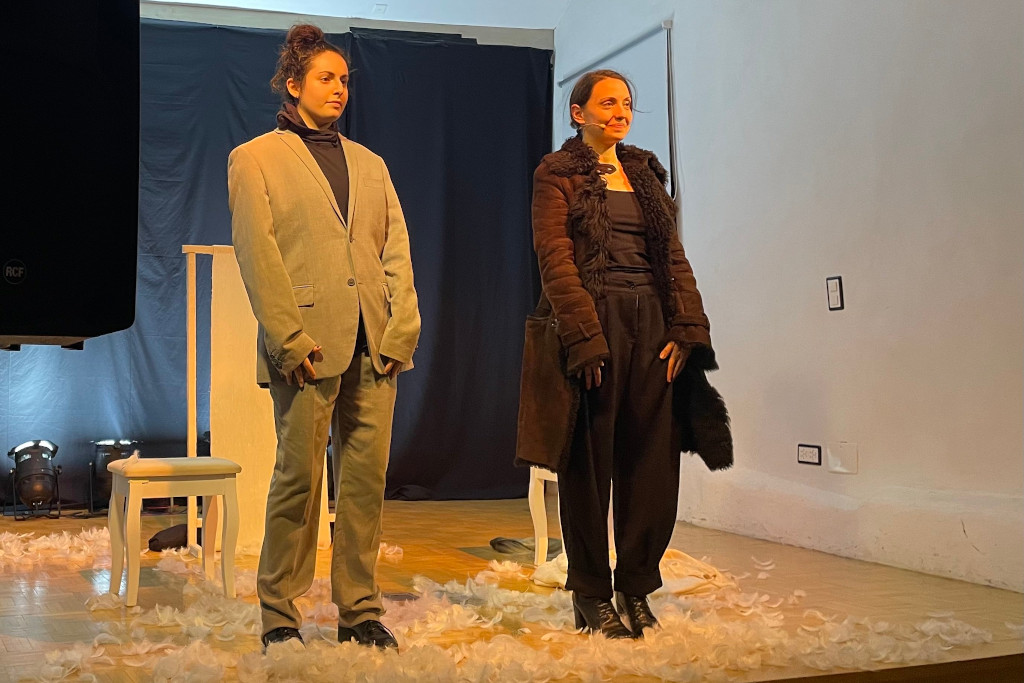 Il dramma tratta il tipico triangolo d’amore: lui, che amava lei, e che ora ama un’altra. Al centro, i frammenti e le immagini di questa storia donano agli spettatori uno scorcio sull’amore e sulle sue sfaccettature, tribolate e intricate, attraverso toni tragici e al contempo ironici. In scena ci sono lei e l’altra: la donna tradita, capelli e vestiti scuri, con un tono rauco e delle movenze inquiete, prona ad un sarcasmo tagliente, frutto del tradimento dell’uomo di una vita, e la sua controparte: l’amante energica, accesa dal nuovo amore, bionda e con un abito bianco, dalle pose composte, graziose, e dall’accento giovane, frivolo, che dà voce a fini provocazioni ma di una seduzione inzuccherata, quasi al limite della banalità. Insomma, giorno e notte; chiaro e scuro. Entrambe vivono le conseguenze dell’amore: da una parte attraverso il travaglio derivato dal troncamento di una relazione, dall’altra tutta l’euforia di una passione fresca. Nel frattempo, gli intermezzi onirici di Erica Galante, la quale, travestita, interpreta la punta del triangolo amoroso: l’uomo amante e traditore, il fantasma silente dell’uomo conteso, che cela, dietro maschera, una presenza sfuggente e simbolica, goffa ed inetta, di una personalità che ha inciso nella vita delle due donne.