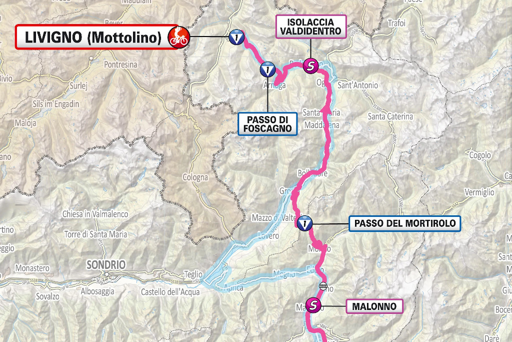 Pertanto, la 15^ tappa del Giro d’Italia, Manerba del Garda – Livigno, viene variata come segue: dopo aver risalito la Val Camonica, la corsa, superata Edolo, anziché salire verso l’Aprica svolta verso il Mortirolo che si scala dal versante di Monno (pendenze massime solo negli ultimi chilometri a San Giacomo attorno al 16%). La discesa sarà su Grosio e la risalita della Valtellina fino a Bormio lungo la vecchia strada che passa da Cepina. Scalata delle Motte fino a Isolaccia seguita dalla salita al passo di Foscagno (14.6 km al 6.5%). Dopo la breve discesa dal Ponte del Rez (poco prima di Trepalle) si sale al passo di Eira dove si ritrova il percorso originale che risale la strada asfaltata lungo la pista del Mottolino.