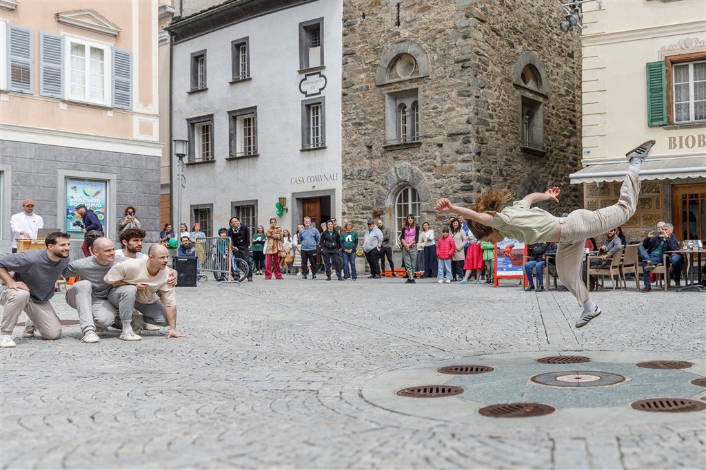 Va sottolineato che i partecipanti alla performance sono stati preparati sabato pomeriggio e domenica mattina e la maggior parte di loro non aveva un’esperienza di danza contact improvisation. Giuseppe Asaro è riuscito a dar loro le basi di contact improvisation, di presenza, di ascolto e la struttura che ha reso la performance un momento intimo e al contempo di collegamento tra performer e pubblico, rispondendo appieno al titolo “confini”. La performance era accompagnata da una delicata musica suonata dal vivo con Thomas Rohrer. Non da ultimo, anche il liscio ha entusiasmato la piazza, con la simpatica e bella presenza degli ospiti di Livigno del Gruppo appassionati di liscio, che si è esibito da solo con due balli, per poi coinvolgere la gente in piazza per gli ultimi due, invadendo la piazza di felicità e gioia. I corsi (liscio con Emanuela Zini – Livigno), contact improvisation con Giuseppe Asaro (Porto Ronco/Ascona) e irlandesi con Elisa d’Alessandro (Poschiavo) per gli adulti e un corso per i più piccoli (Federica Esposito di Sondrio che insegna alla Scuola Musicale di Poschiavo) sono stati molto apprezzati dai partecipanti e in tutti i corsi regnava un senso di piacere, allegria, soddisfazione (e sudore!).