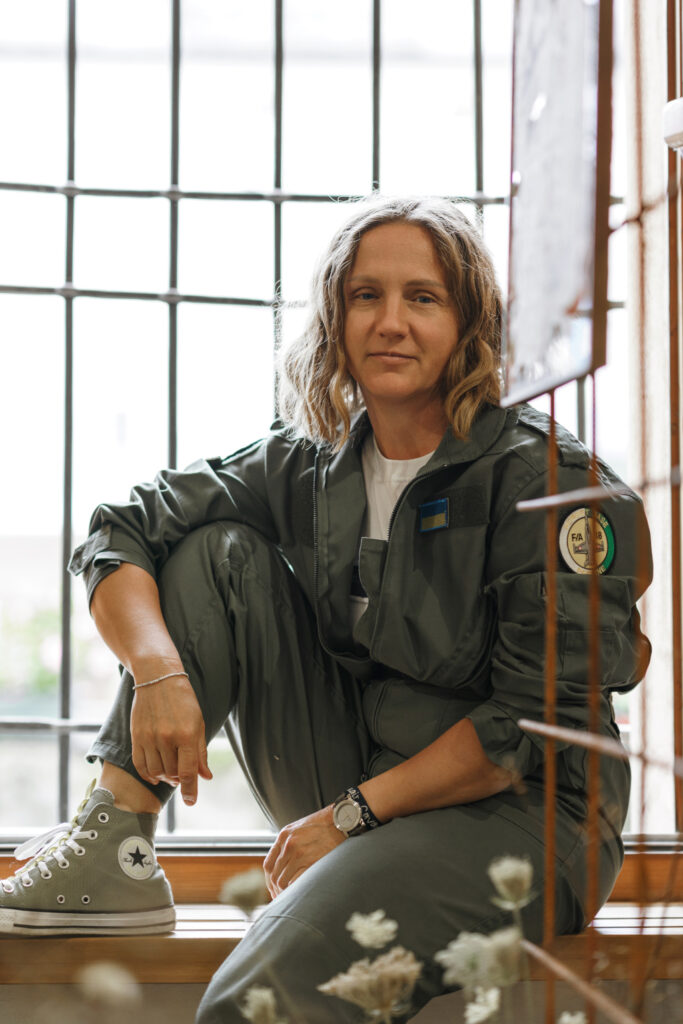 No, non è un’espressione artistica. Prima di tutto, i miei vestiti sono molto comodi, quindi mi sento a mio agio. In secondo luogo, mi piace il tema dell’aviazione, e c’è un marchio ucraino che produce abbigliamento ispirato all’aviazione, quindi è perfetto: tema aeronautico e comfort.