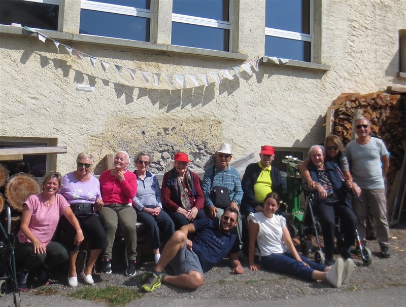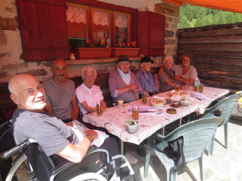 Ad attendere il gruppo, oltre al panorama stupendo, c’era Daniela, gerente dell’Alpe Campo, che aveva preparato una squisita merenda a base di salametti e formaggi 100% Valposchiavo. Piacevolmente chiacchierando, mangiando e bevendo, l’ora del rientro è giunta anche troppo veloce. A malincuore, non prima d’un saluto da lontano ad un’abitazione, siamo risaliti sul pulmino per il rientro al piano. Lungo il tragitto ci siamo presi il tempo per una deviazione non programmata verso Pedecosta, Pedemonte e Angeli Custodi, regalando, a chi del posto, uno sguardo sui luoghi natali. Così, dopo aver rifocillato corpo e cuore siamo giunti a “casa”, senza percepire stanchezza, ma ebbri di felicità.