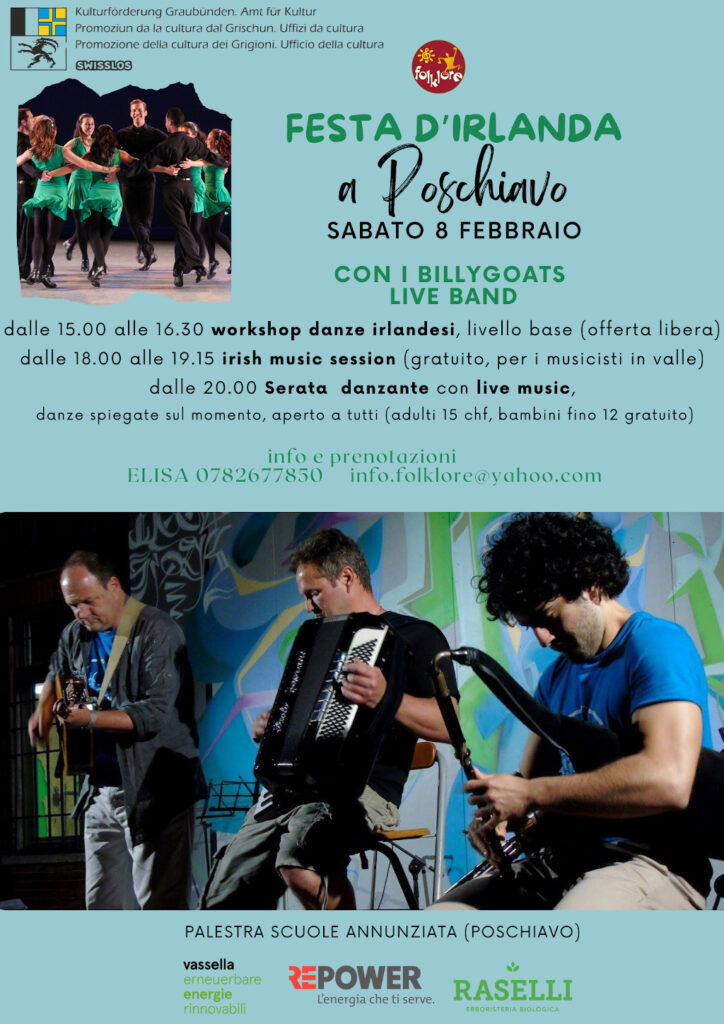 - dalle 20.00 Serata Danzante aperta a tutti, con musica dal vivo Billygoats e animazione con Elisa D’Alessandro. Si partecipa ad una vera e propria serata danzante, con musica dal vivo ed animazione sul posto. Non servono esperienze pregresse di danza, si impara tutto sul posto e si ascolta buona musica. Ingresso 15,00 chf