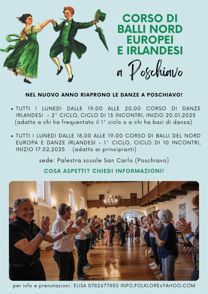 Da Lunedi 17 febbraio , dalle 18.00 alle 19.00 , partirà un nuovo ciclo di 10 incontri di balli popolari del nord europa e danze irlandesi, c/o Palestra S.Carlo di Poschiavo. Adatto a tutti!
