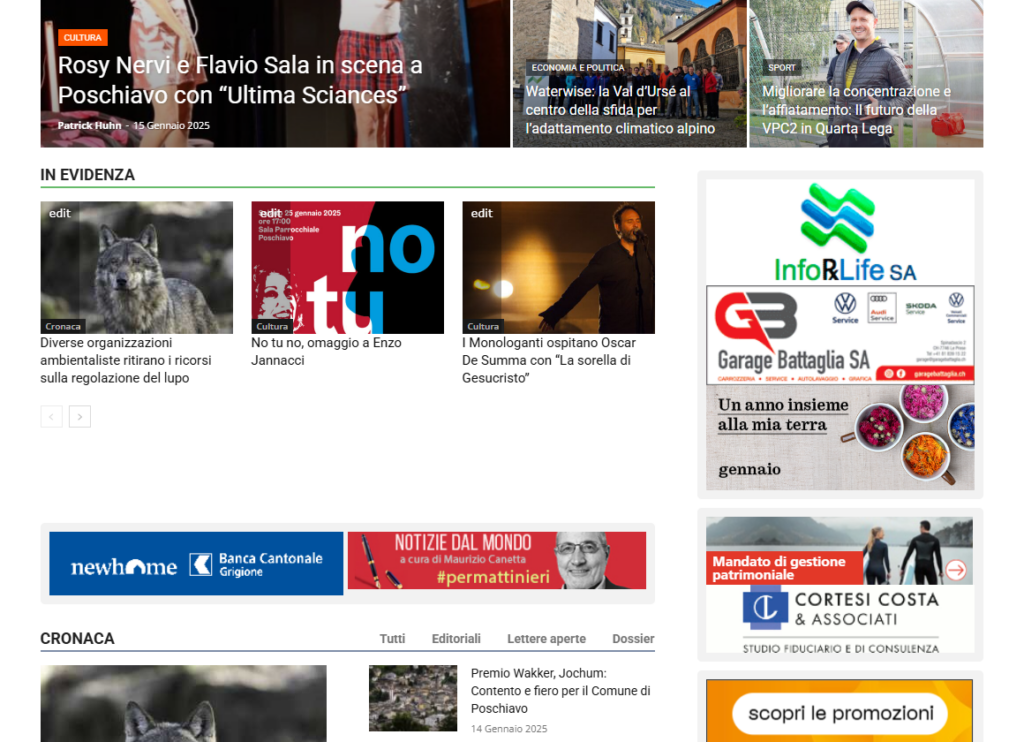 Con questa nuova offerta esclusiva, archivio.ilbernina.ch è in grado di proporre ai propri abbonati un servizio di informazioni a 360 gradi. Essenzialmente archivio.ilbernina.ch continua ad essere un giornale regionale online che propone articoli fatti in casa, di carattere locale. Al tempo stesso, come in passato, il lettore troverà alcune notizie cantonali che interessano la nostra regione, prodotte dall’agenzia pubblica ATS. Inoltre – questa la novità – ogni mattina troverete sulle nostre pagine un riassunto dei fatti salienti di cronaca nazionale e internazionale selezionati con competenza e professionalità da Maurizio Canetta.