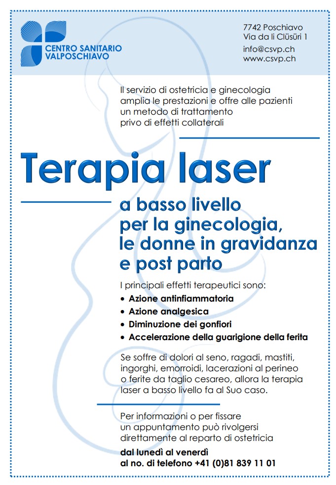 Da inizio anno il CSVP offre un nuovo servizio nell’ambito della ginecologia e ostetricia, fruibile attraverso l’ambulatorio ostetrico. L’offerta consiste nell’utilizzo della terapia laser a basso livello, efficace nel recupero postparto, nel trattamento di disturbi ginecologici e nell’assistenza post operatoria. L’obiettivo del servizio è di offrire in Valposchiavo un tipo di prestazione nuova, sostenendo le donne nel processo di guarigione e terapia del dolore.