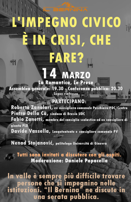 In valle è sempre più difficile trovare gente che si impegni nelle istituzioni. Il Bernina ne discute in una serata pubblica il 14 marzo alle ore 20.30 presso La Romantica di Le Prese.