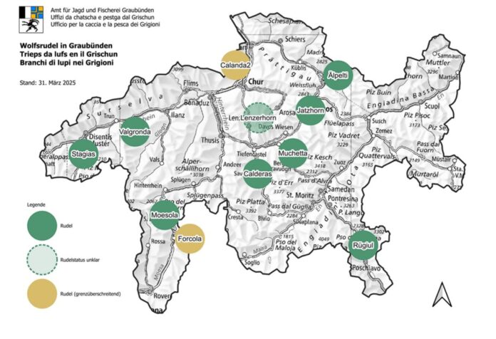 Attualmente, sono confermati otto branchi di lupi all’interno del Cantone dei Grigioni e due branchi transfrontalieri. Tuttavia, per un branco non è possibile stabilire se, dopo le recenti regolazioni, esista ancora. In particolare, nei territori precedentemente occupati dai branchi Fuorn e Vorab, non sono più presenti animali, indicando la possibile dissoluzione di questi gruppi.