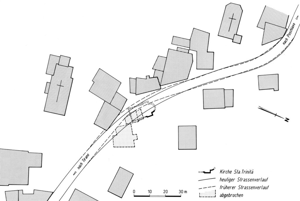 Resa inutile dalla costruzione della nuova chiesa cattolica di San Carlo, prima, e dalla chiesa riformata, poi, abbandonata e sepolta, la chiesa della Santa Trinità – e il ricordo della sua esistenza – ritornò brevemente a fare capolino a Brusio cinquant’anni fa, per poi sparire di nuovo, sotto l’asfalto della nuova strada cantonale e dell’adiacente parcheggio.
