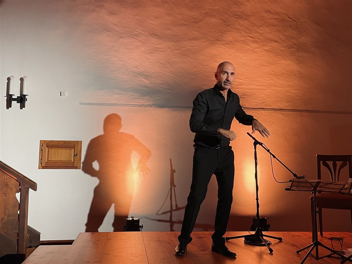 A dar voce ai testi boccacciani sono stati due interpreti d’eccezione: l’attore e regista Andrea Macaluso, con la sua carica espressiva e l’inconfondibile inflessione toscana, e il chitarrista e compositore Francesco Morittu, le cui note, ispirate al repertorio trecentesco, coevo alla composizione dell’opera, si sono intrecciate alle parole, arricchendone la risonanza narrativa ed emotiva. Insieme, i due interpreti hanno trasformato tre novelle in racconti vivi e coinvolgenti, il tutto reso ancora più speciale dall’atmosfera raccolta e suggestiva del palco di Casa Torre.