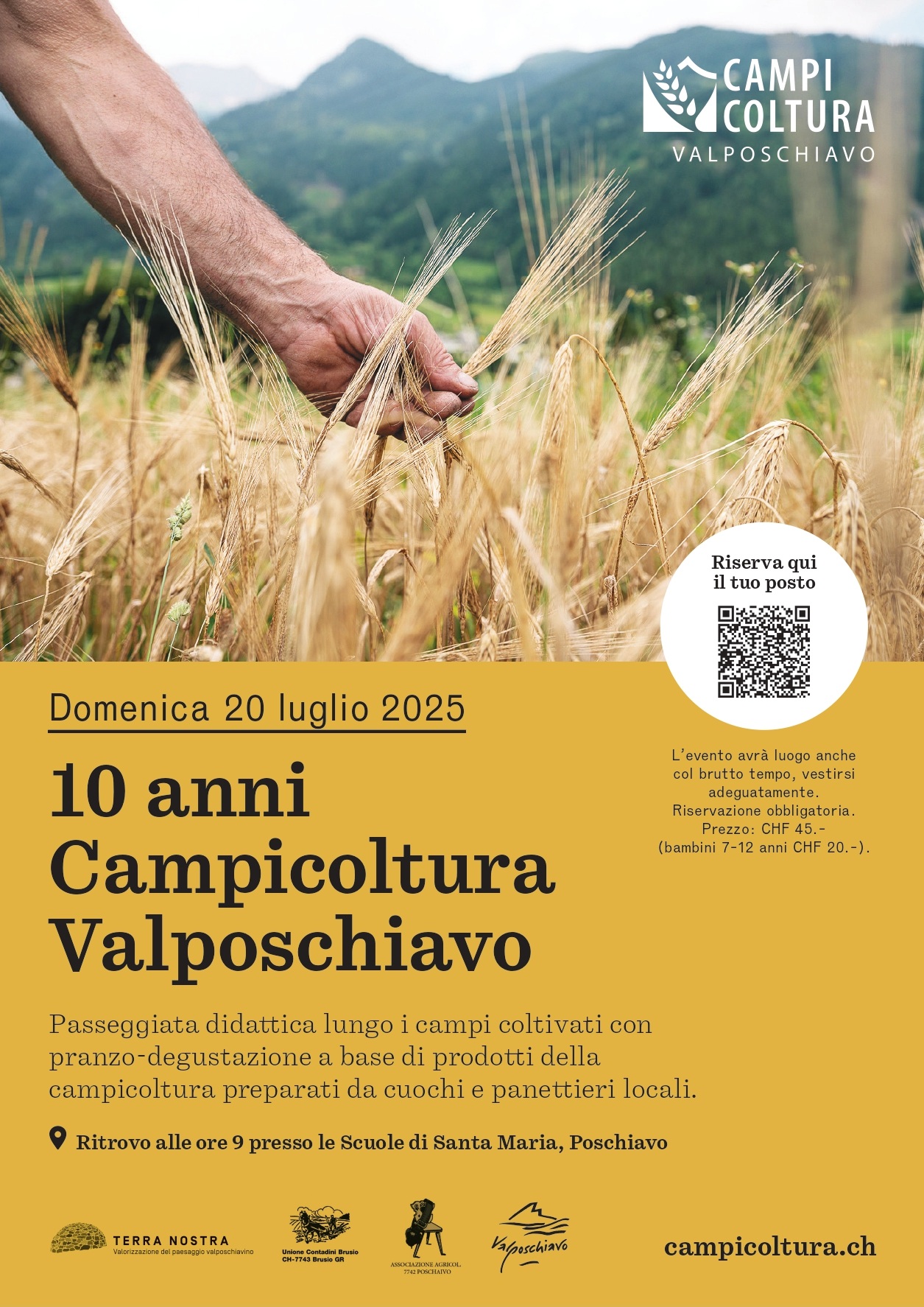 Per questioni organizzative la riservazione è obbligatoria. Informazioni e biglietti si trovano sul sito www.campicoltura.ch o presso Valposchiavo Turismo: