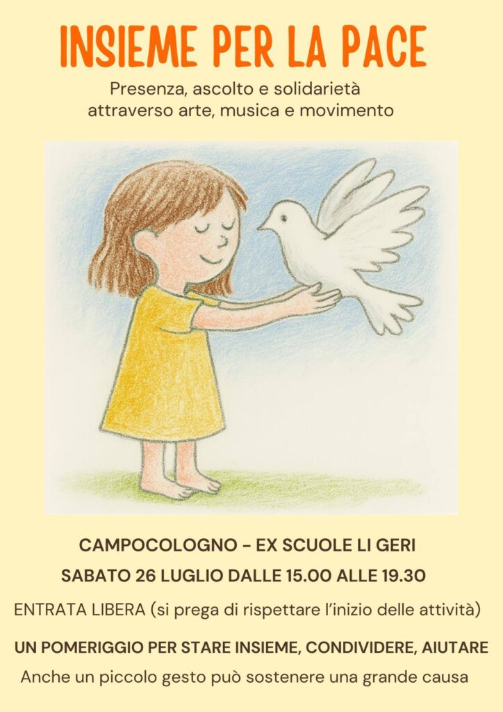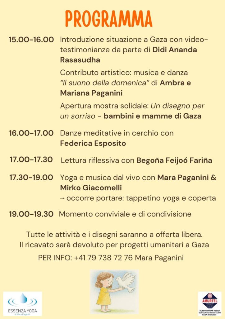 Sabato 26 luglio, presso le scuole Li Geri di Campocologno, si terrà una giornata dal titolo “Insieme per la pace”, un’iniziativa ideata da Mara Paganini con l’intento di raccogliere fondi per progetti umanitari a Gaza e, soprattutto, di creare uno spazio di ascolto, presenza e riflessione collettiva.