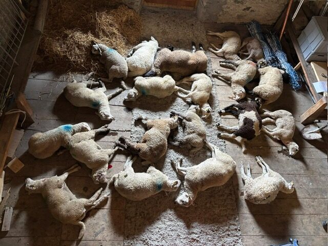 22 agosto 2025, Alpe pecore Muot Selvas/Val Fex in Engadina Alta: attacco di lupi al gregge di pecore protetto da 2-3 pastori e da recinzione (16.3 km di reti). Il bilancio: 12 pecore sbranate, 25 pecore squarciate (secondo disposizione del veterinario da ammazzare subito), 12 pecore ferite ma curabili, 9 pecore scomparse.