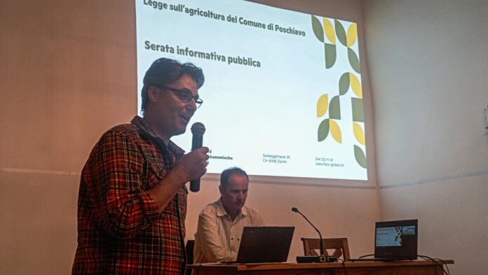 A Poschiavo lo scorso giovedì sera, 11 settembre, è stata presentata alla popolazione la nuova Legge sull’agricoltura, che sarà sottoposta al voto popolare il prossimo 28 settembre. Fulvio Betti, capo del dipartimento agricoltura, e Gianluca Giuliani, consulente agrario, hanno illustrato i contenuti di un testo che, se approvato, sostituirà una normativa che da oltre sessant’anni regola il settore.