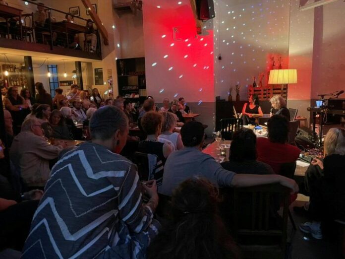 Un evento della Casa della Letteratura dei Grigioni. Sul podio, a sinistra, la direttrice Martina Mutzner.