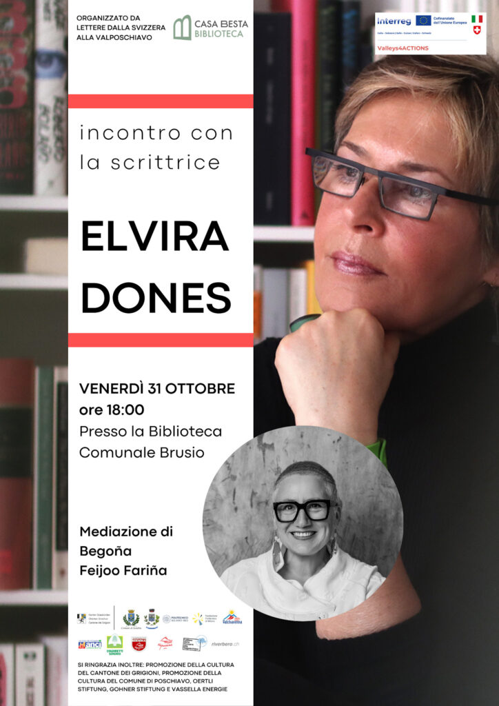 L’associazione Lettere dalla Svizzera alla Valposchiavo, in collaborazione con la Biblioteca Comunale di Brusio, propone, venerdì 31 ottobre alle ore 18:00 un incontro con la scrittrice e documentarista Elvira Dones.