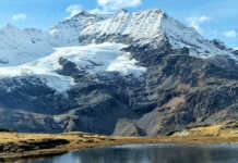 La foto di Bruno Raselli ai laghetti presso il "Bügliett" a 2400 metri, sullo sfondo il Piz Cambrena.