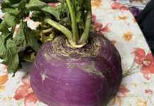 Rapa coltivata a Garbella (Comune di Brusio) a 1040 m.s.m… da una novantenne.Dimensioni: diametro 17 cm, circonferenza 60 cm, peso 3130 gr.