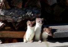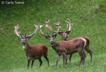 Tre cervi maschi con le corna di velluto pronti per la foto ricordo