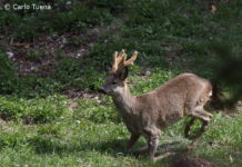 Capriolo maschio con corna di velluto sorpreso dal fotografo