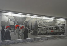 Attualmente sulle pareti del sottopassaggio della stazione di St. Moritz è in corso la posa di grandi mosaici che rappresentano immagini d'epoca della ferrovia...