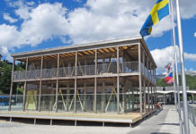 Sul piazzale della stazione di St. Moritz è stato recentemente installato, in meno di tre settimane, un edificio prefabbricato di legno con una vista sul...