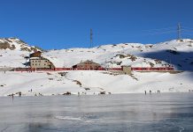 La stazione dell’Ospizio Bernina vista dal centro del Lago Bianco ghiacciato.
