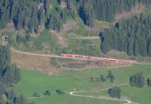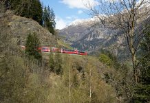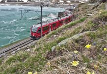 Il Bernina Express in transito a Palzadoir prima di entrare in galleria (Varuna II) e di arrivare alla stazione di Cadera.