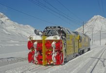 Nei mesi di gennaio e febbraio 2016 la Xrot 9213, o spazzaneve rotativo a vapore, ripercorre il tratto della Ferrovia del Bernina che separa Pontresina dalla...
