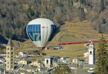 All'inizio dell'anno 2016 si è potuta ammirare abbastanza da vicino una mongolfiera sopra i tetti di Poschiavo, in volo proprio mentre sopraggiunge il treno rosso della Ferrovia...