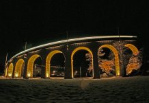 Il transito di un treno sul viadotto di Brusio innevato, al buio, crea uno spettacolo suggestivo che merita uno scatto.