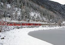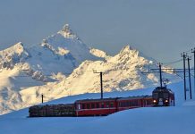 Paesaggio invernale in tarda serata durante il transito di un convoglio della Ferrovia del Bernina nei pressi del Lago Bianco. Sullo sfondo il Piz...