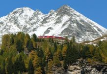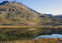 Il treno della Ferrovia del Bernina in transito nei pressi del Lago Nero. Sullo sfondo il Piz Lagalb.