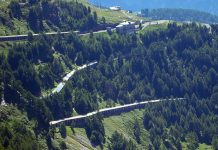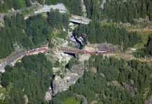 Il Bernina Express, visto dal Sassalbo, mentre transita sulle strette curve e i vari ponti del fiume Cavagliasco.